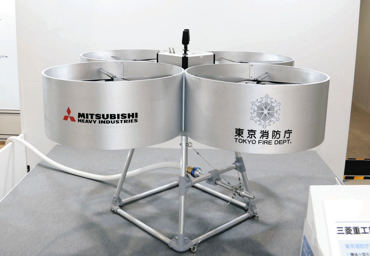 東京消防庁が三菱重工業と開発している消火活動用ドローン。上部にプロペラがつき、下部に放水用の部品が取り付けられている=東京都江東区で