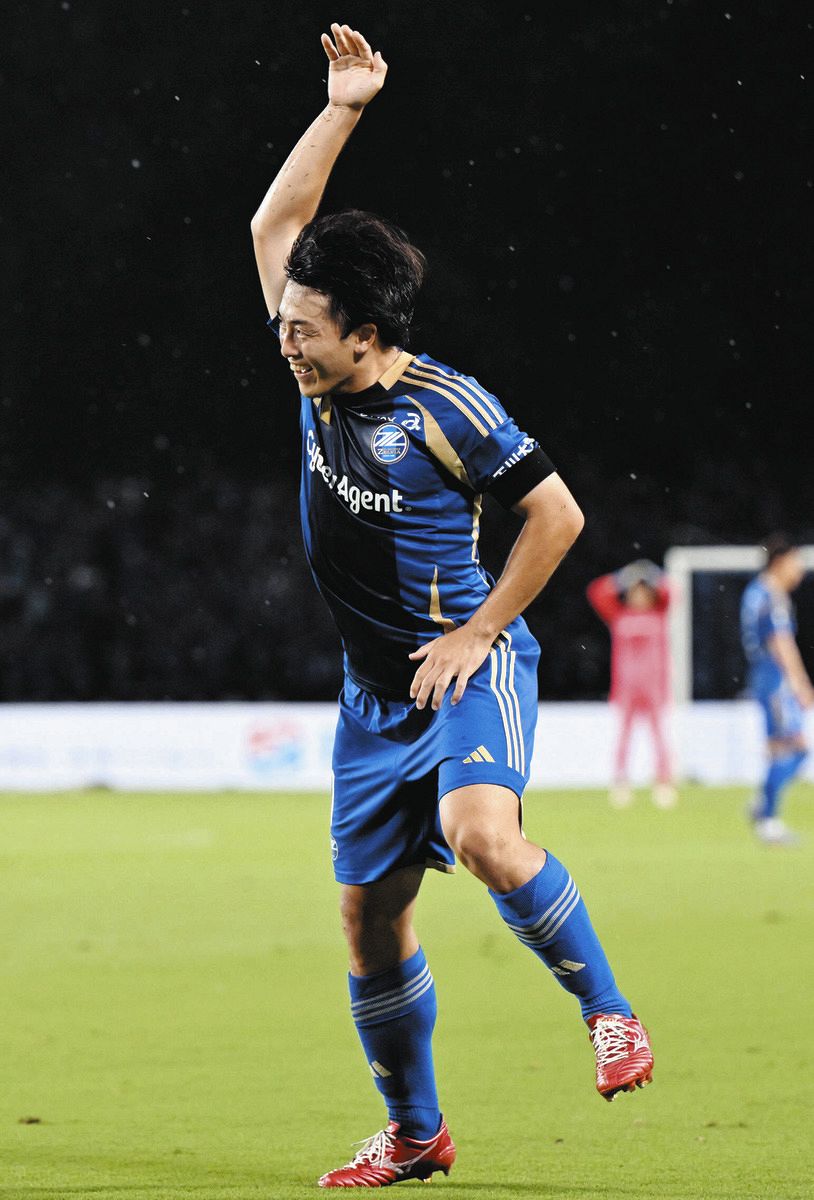 恐竜を模したゴールパフォーマンスを披露する相馬=8月10日、Gスタで(芹沢純生撮影)