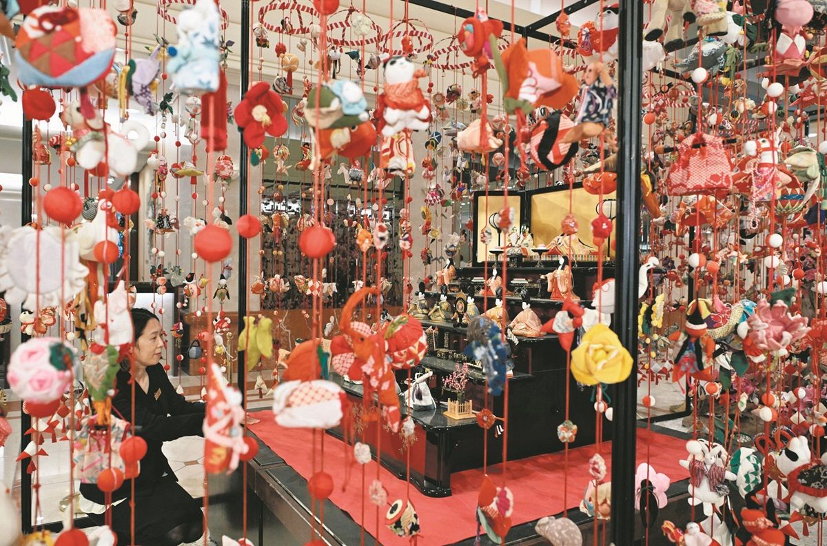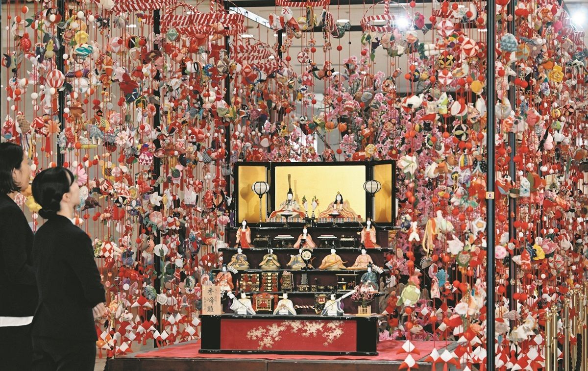ひな祭りの3日、東京都新宿区の京王プラザホテルでは、縁起物の人形など約5000個が使われた「つるし飾り」や、伝統的な木目込み人形「真多呂(またろ)人形」の段飾りが訪れた人の目を楽しませた。31日まで展示され、館内が華やかな雰囲気に包まれている。