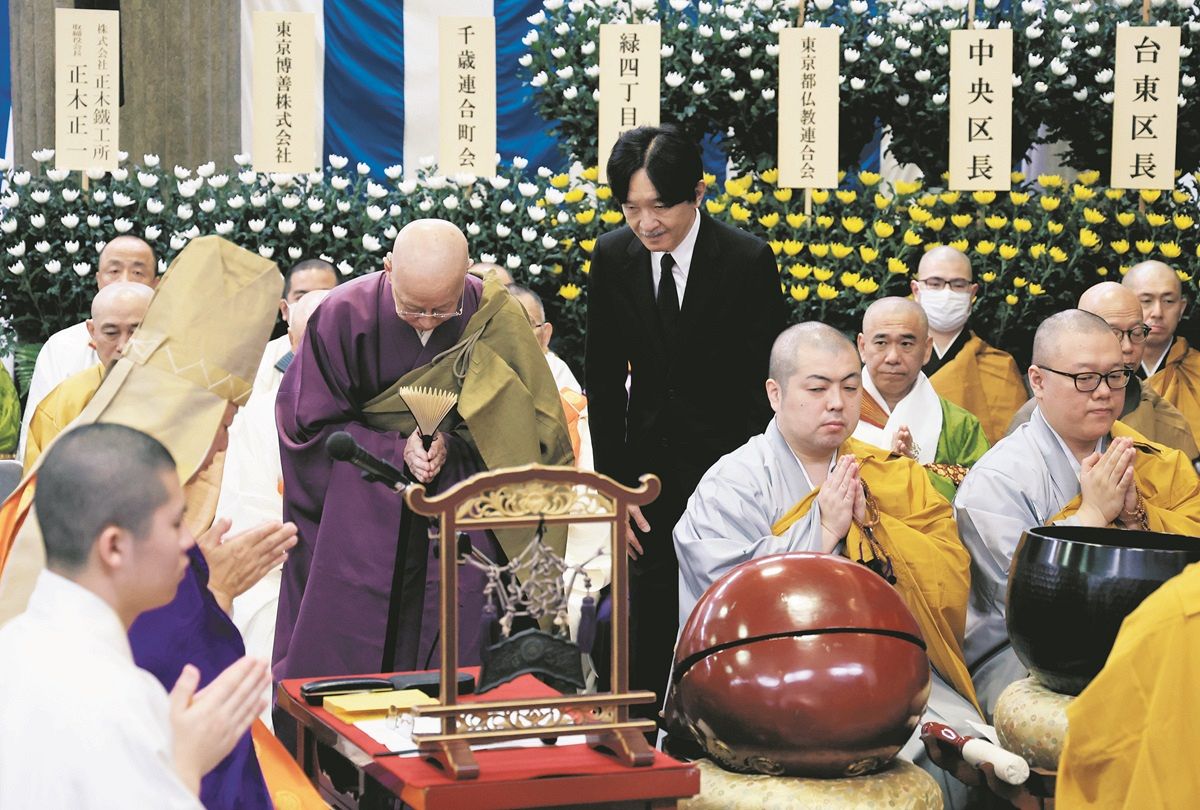 「都内戦災並びに関東大震災遭難者春季慰霊大法要」で焼香を終えられた秋篠宮さま=10日、東京都墨田区の東京都慰霊堂で(代表撮影)