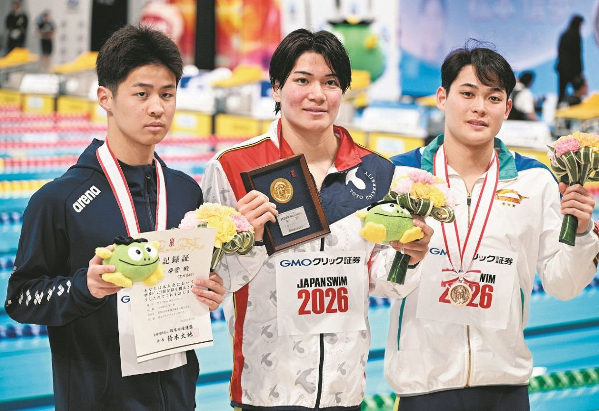 男子200㍍個人メドレーで優勝した松下知之㊥、2位の小島夢貴㊧、3位の小方颯=3月21日、東京アクアティクスセンターで(潟沼義樹撮影)
