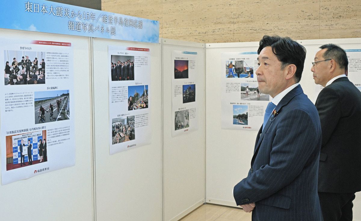 発生から15年となった東日本大震災と、一昨年の能登半島地震の被災地を撮った報道写真パネル展が、東京都品川区の城南信用金庫本店で開かれている。23日、瀬戸隆一復興副大臣が訪れ、震災の記憶を風化させず、早期の復興を願う展示を視察した。