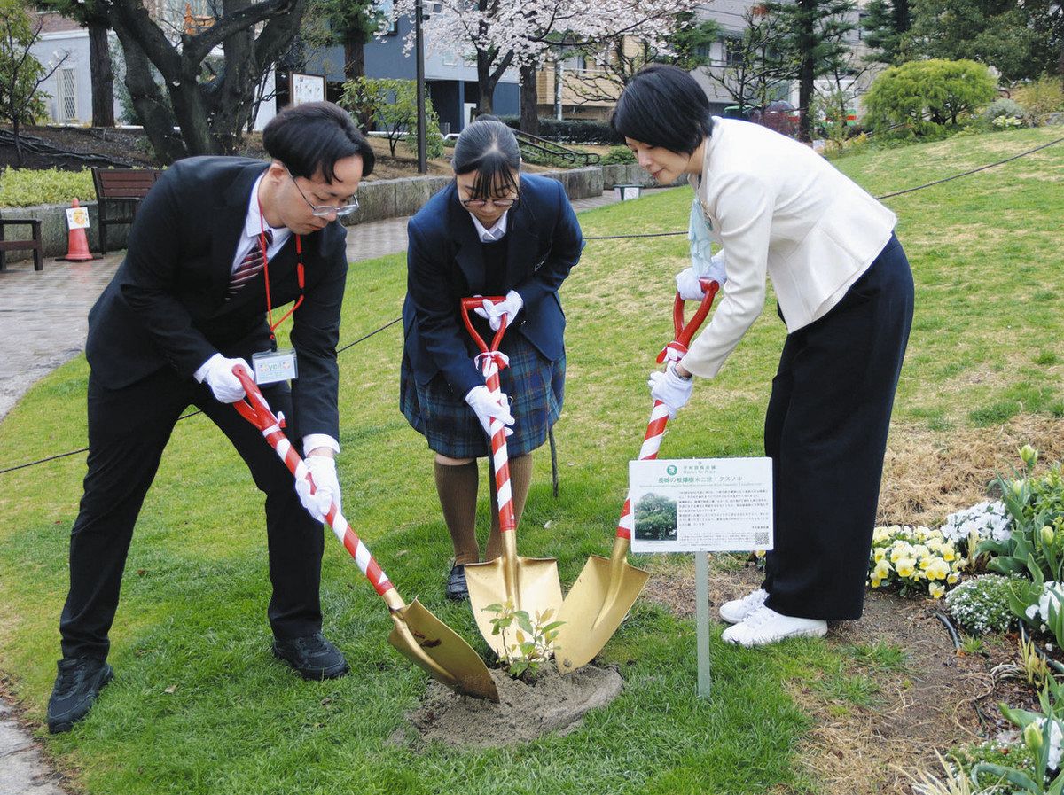 植樹式は3月25日にあり、本年度の広島・長崎平和使節として派遣された高校生、森沢恭子区長らが...