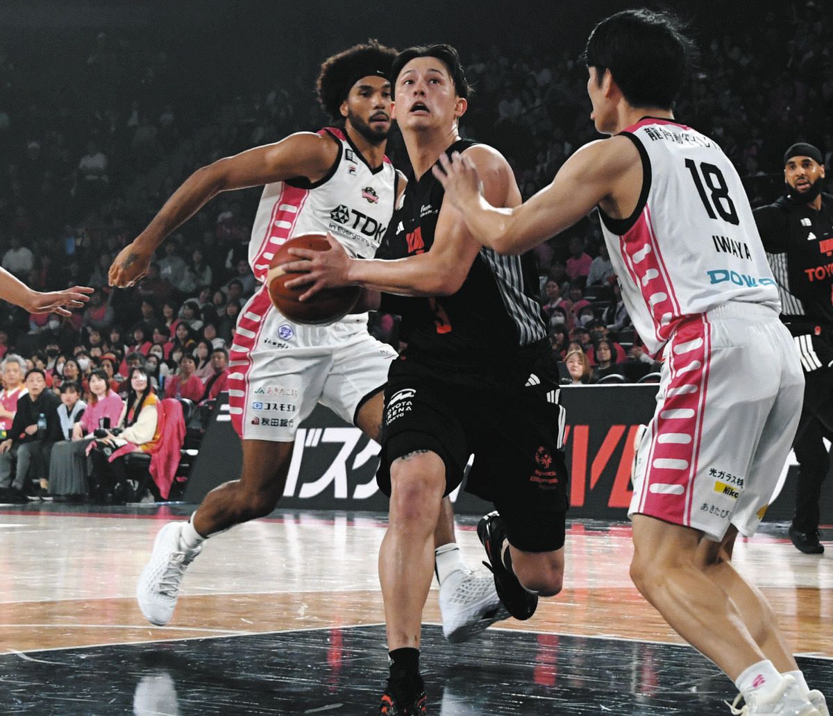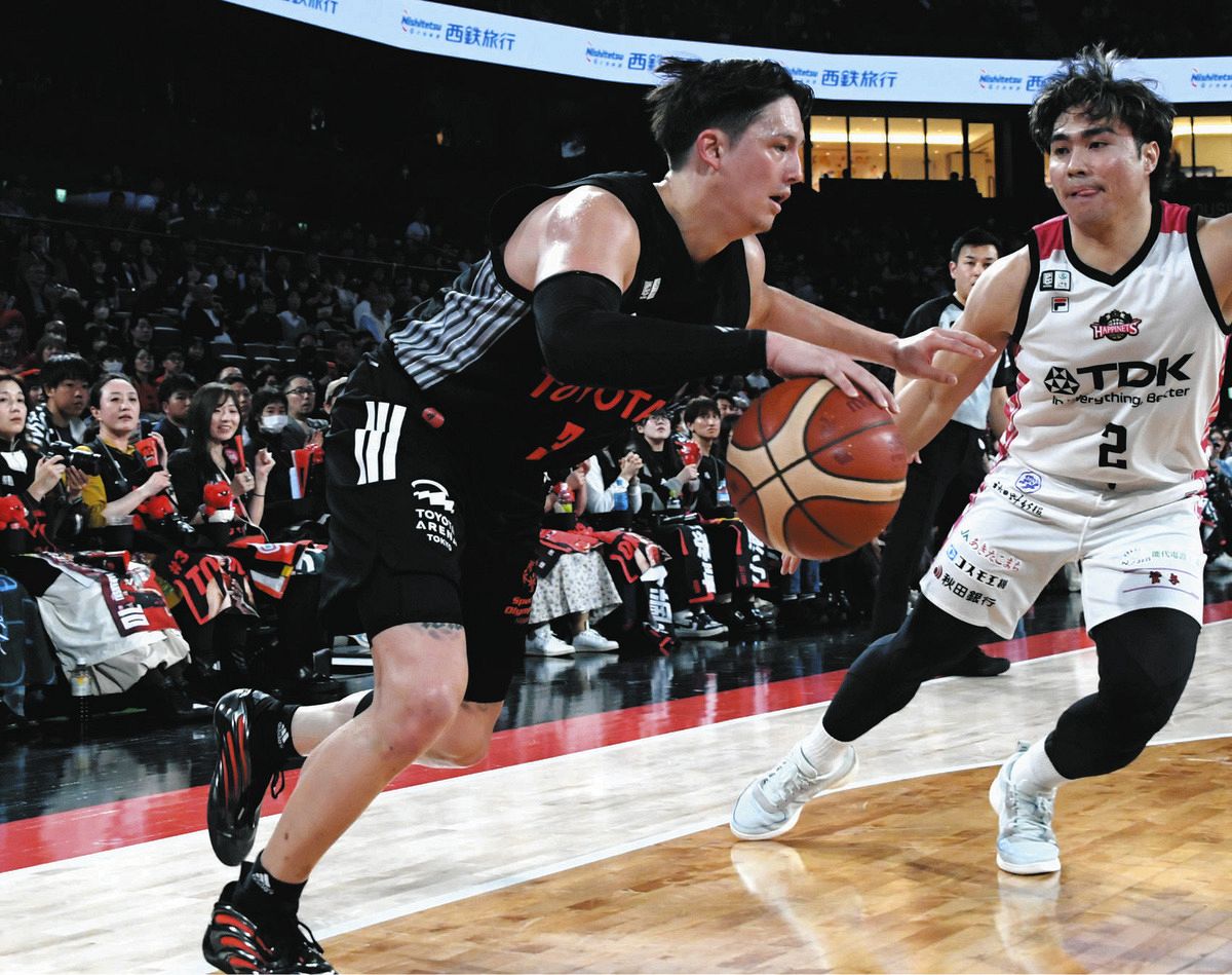 A東京ー秋田ドライブを仕掛けるA東京のテーブス(左)=4日、トヨタアリーナ東京で(渡邉陽太郎撮影)A東京らしさを取り戻すため、1勝が必要だった。チームプレーを優先し、攻守で流れをつくった司令塔のテーブス海は「アルバルクのバスケットで勝てた」と喜んだ。一方で「自分らしいプレーで引っ張りたい思いはある」と葛藤も明かす。