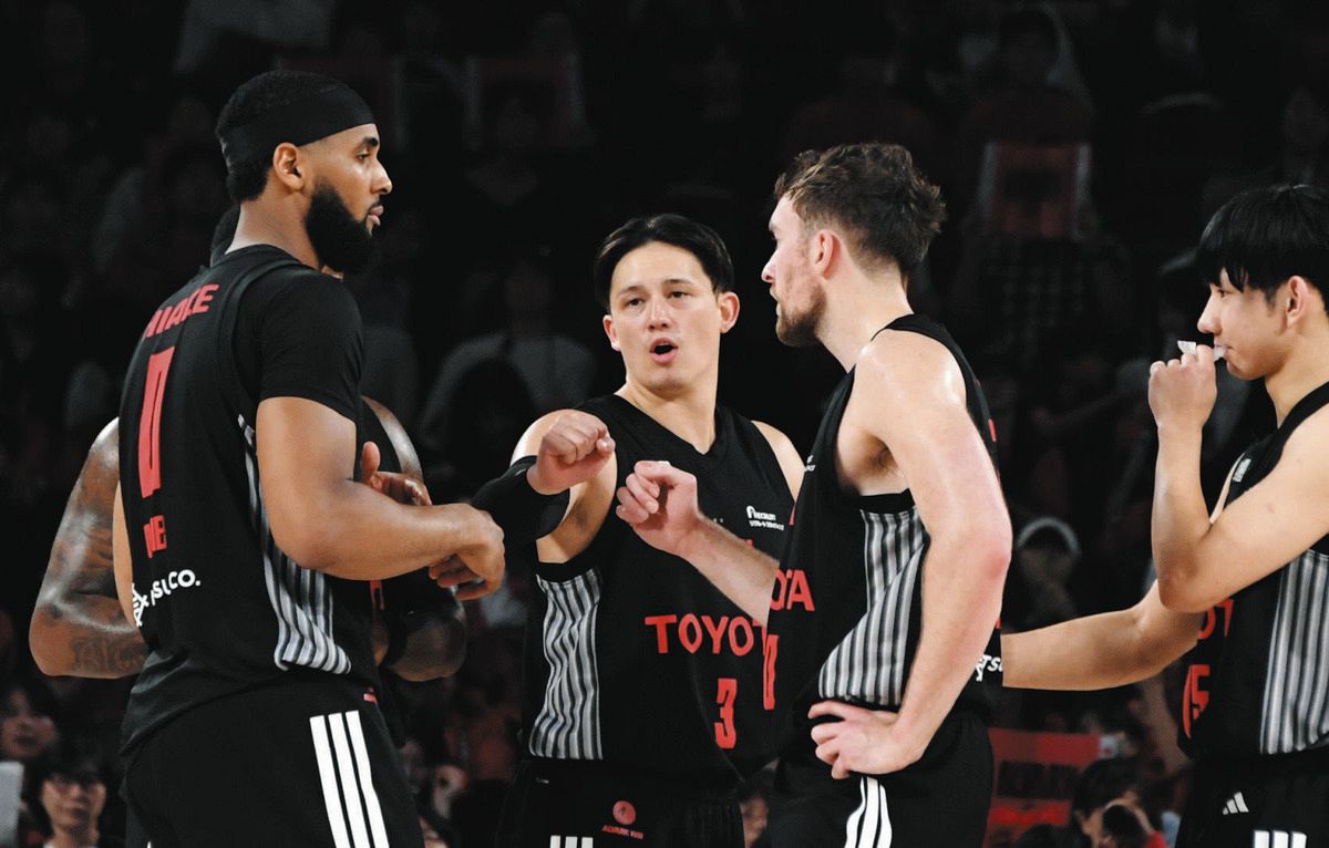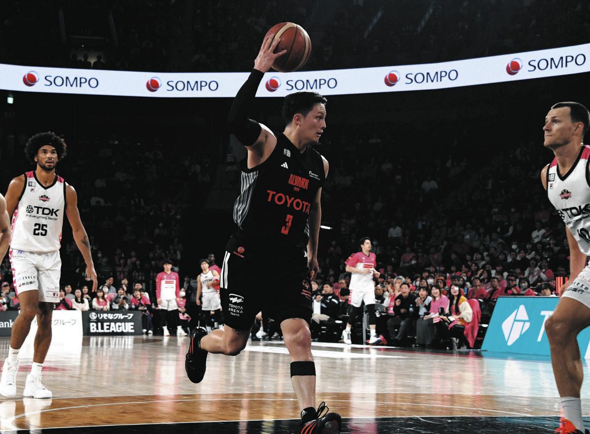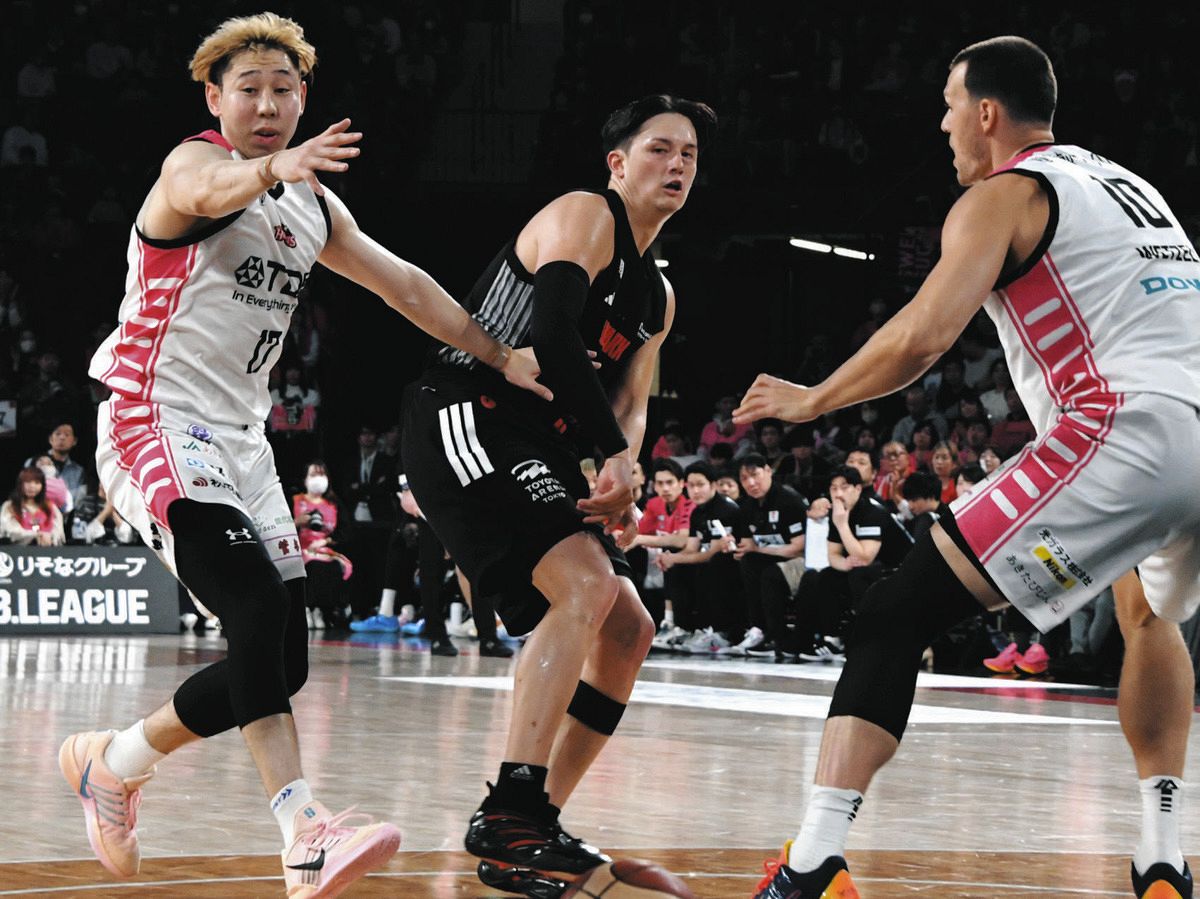 A東京ー秋田シュートを打つふりをした直後、味方に自身の頭の後ろを通すノールックパスを出すA東京のテーブス(中)=4日、トヨタアリーナ東京で(渡邉陽太郎撮影)守備の強度も高かった。得点できる場面でも、より確率の高いプレーを冷静に選択。第2戦は5ファウルで退場したものの、指揮官は「積極的に行った結果」と、チーム優先の姿勢を貫いたエースをねぎらった。A東京らしいプレーでプレーオフ、チャンピオンシップ(CS)進出圏内に再浮上。テーブスも笑顔を見せた。