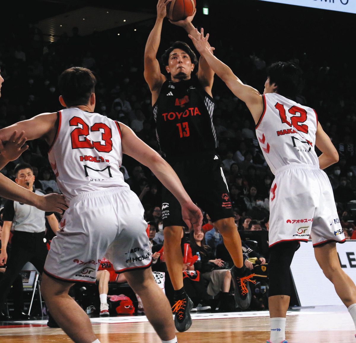 2025年11月16日の名古屋D戦、シュートを放つA東京の菊地(奥)=トヨタアリーナ東京で(渡邉陽太郎撮影)