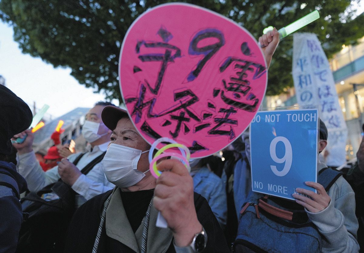ペンライトやうちわを手に憲法9条の改憲に反対の声を上げる人ら=東京都新宿区で(木戸佑撮影)