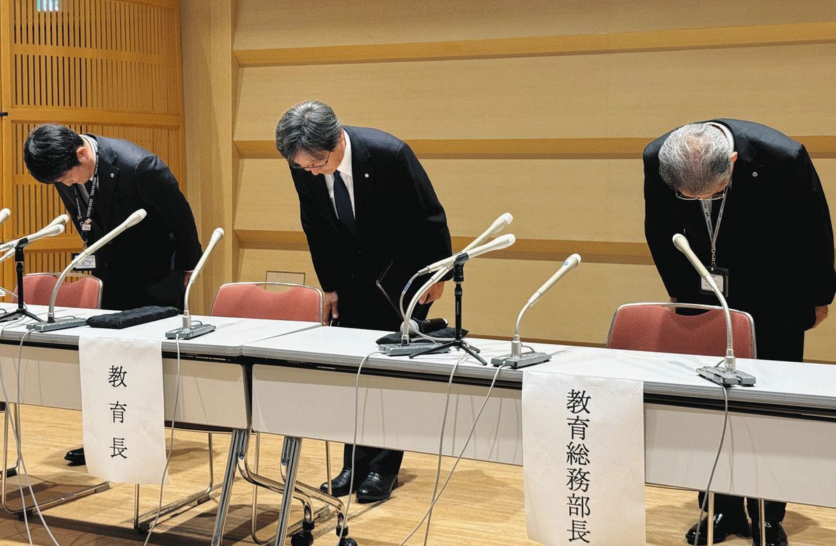 区立小教諭が盗撮疑いで逮捕された事件で、謝罪する小黒仁史教育長(中)ら=大田区で