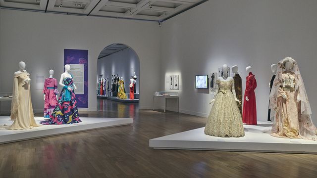 左手前はオペラ歌手の佐藤しのぶのドレス、右手前は劇団四季の浅利慶太の依頼で作られた衣装/「生誕 100 年森英恵 ヴァイタル・タイプ」国立新美術館2026年展示風景撮影:小川真輝