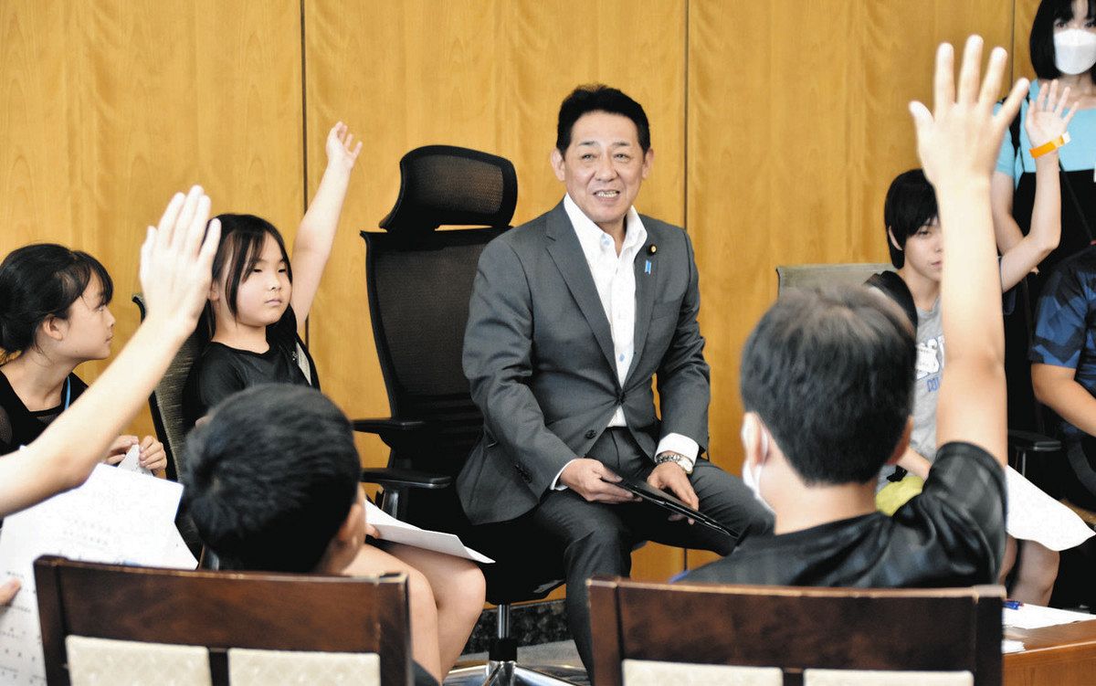 松村国家公安委員長(中)に質問しようと挙手する児童たち=警察庁で