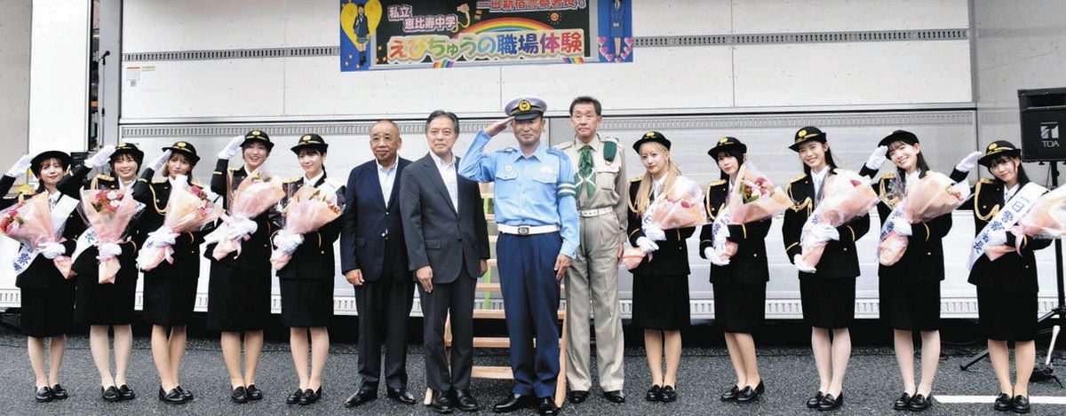新宿署が16日に東京都新宿区内で開いた交通安全イベントに「エビ中」と呼ばれて親しまれているアイドルグループ「私立恵比寿中学」のメンバー10人が登場。連休の繁華街をパレードし、事故防止などを呼びかけた。