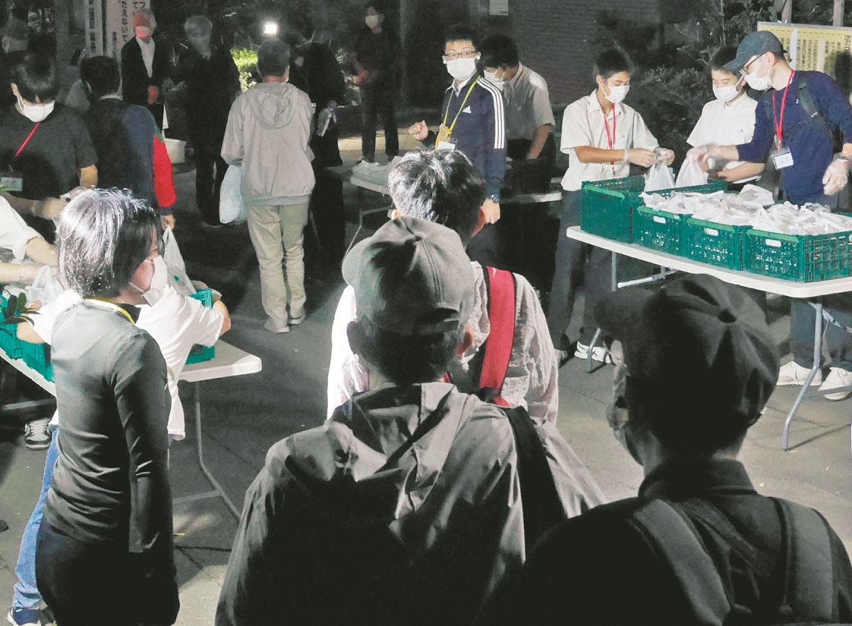 食品配布会で弁当やパンが入った袋を受け取る利用者(中村真暁撮影)