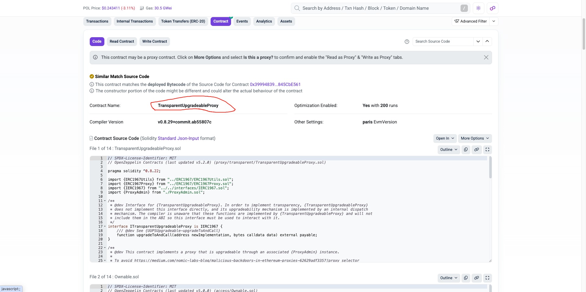 しかし、経験豊富な投資家なら知っています。物語を聞くのとオンチェーンを確認するのは別です。実際に確認すると、AKAS のコア資金・トークン契約は TransparentUpgradeableProxy + ProxyAdmin 構造で、初期オーナーは依然としてデプロイヤー(アドレス 0xe3358…F6411B)です。これはコンストラクタ引数やバイトコードで明らかです。アップグレード可能が即ちバックドアとは限りませんが、「ロジック差し替え・権限変更可能」を意味し、「権限放棄」というマーケティングと真っ向から矛盾します。要するに、台所の鍵は失われておらず、元の持ち主のポケットにあります。