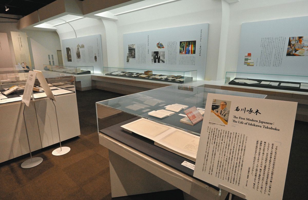展示品について話すドナルド・キーン記念財団のキーン誠己理事長=いずれも世田谷区の世田谷文学館で