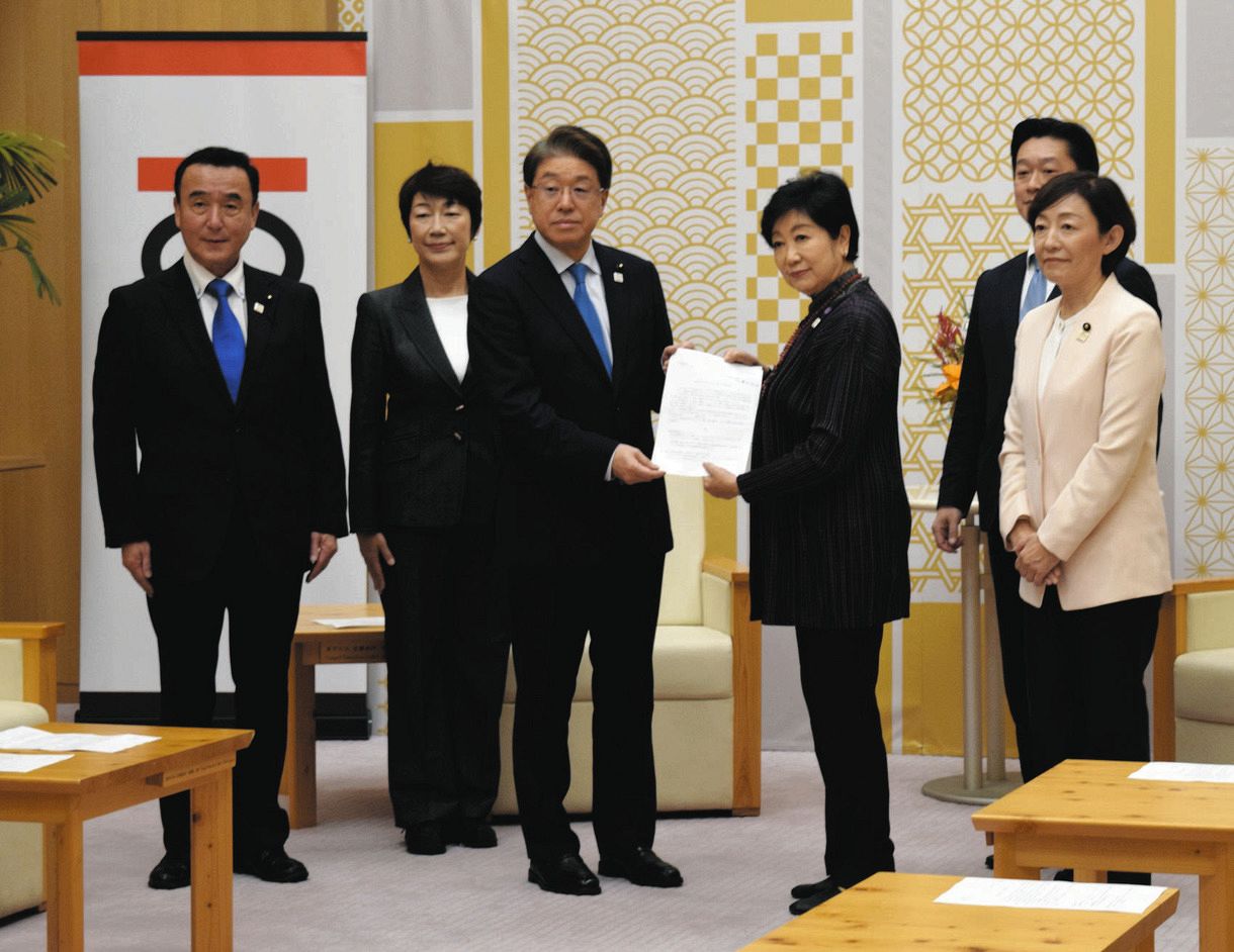 補正予算編成に向け、小池百合子知事(右から3番目)に東京アプリのポイント増額などを要望した都議会公明党の議員ら