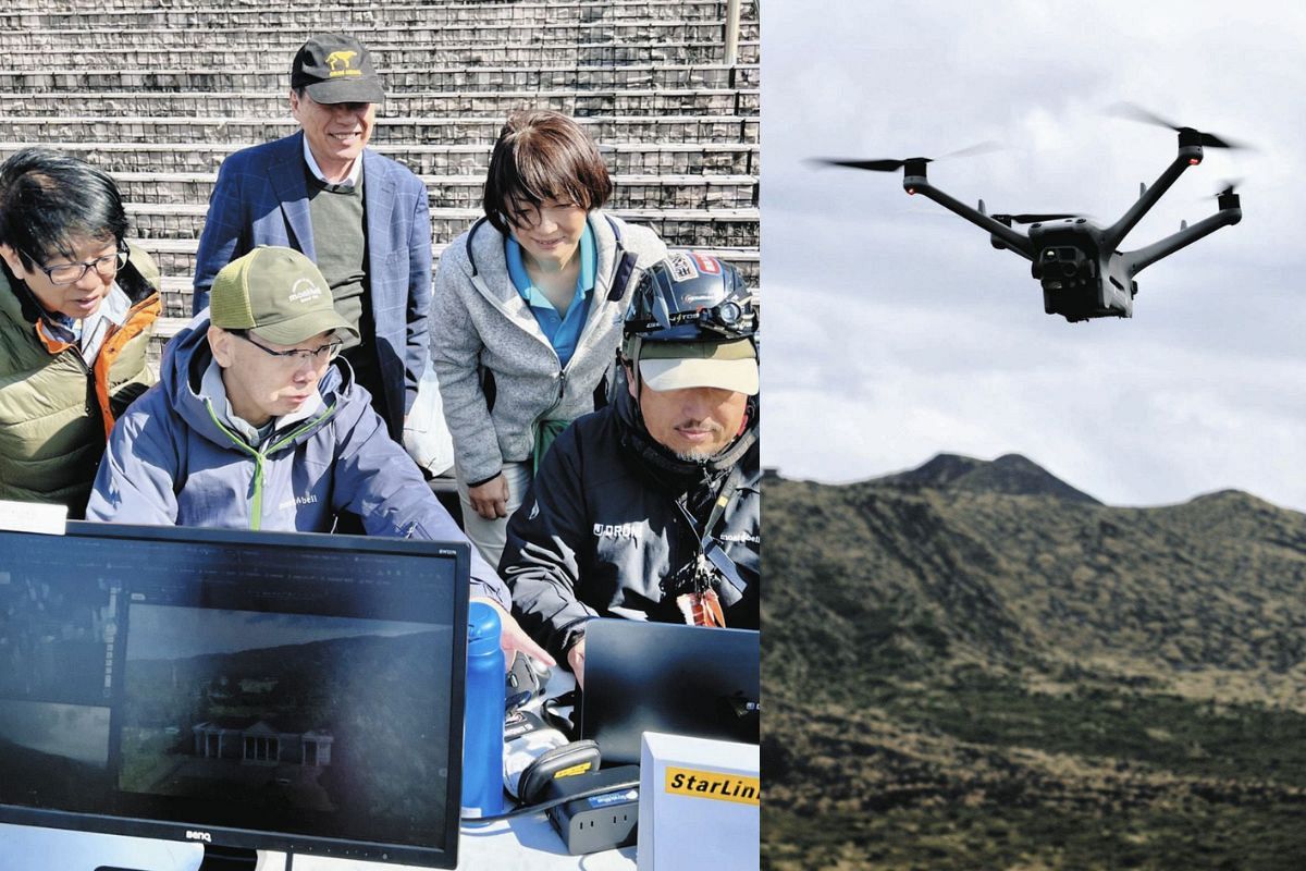 (左)飛び立ったドローンから送られてくる動画を確認する実験チームのメンバーら=東京都大島町元町のジオノスで(右)三原山の火口に向けて溶岩地帯を飛ぶドローン=伊豆大島外輪山展望台で