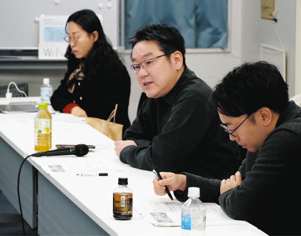 「継承する会」のワーキンググループ会合で、被爆者関連資料の歴史的意義を説明する昭和女子大の松田忍教授(中)=12月13日、東京都千代田区で(中根政人撮影)