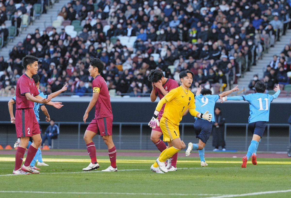 早実-徳島市立前半、徳島市立・芳田(9)に先制ゴールを決められ、肩を落とす早実イレブン=国立競技場で(木戸佑撮影)