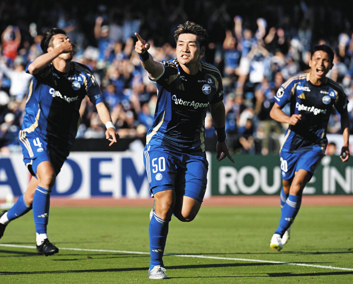 鹿島アントラーズ戦でチーム2点目のゴールを決めて喜ぶFC町田ゼルビアの岡村大八(中)と菊池流帆(左)=6月21日、町田GIONスタジアムで(芹沢純生撮影)