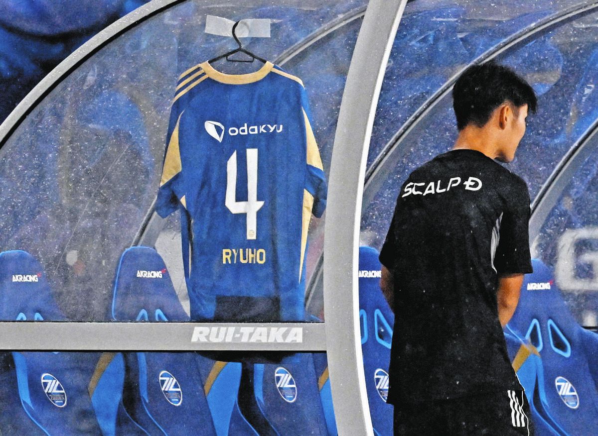 菊池流帆の長期離脱が決まった直後の横浜FC戦。菊池のユニホームがベンチに掲げられた=9月12日、町田GIONスタジアムで(芹沢純生撮影)