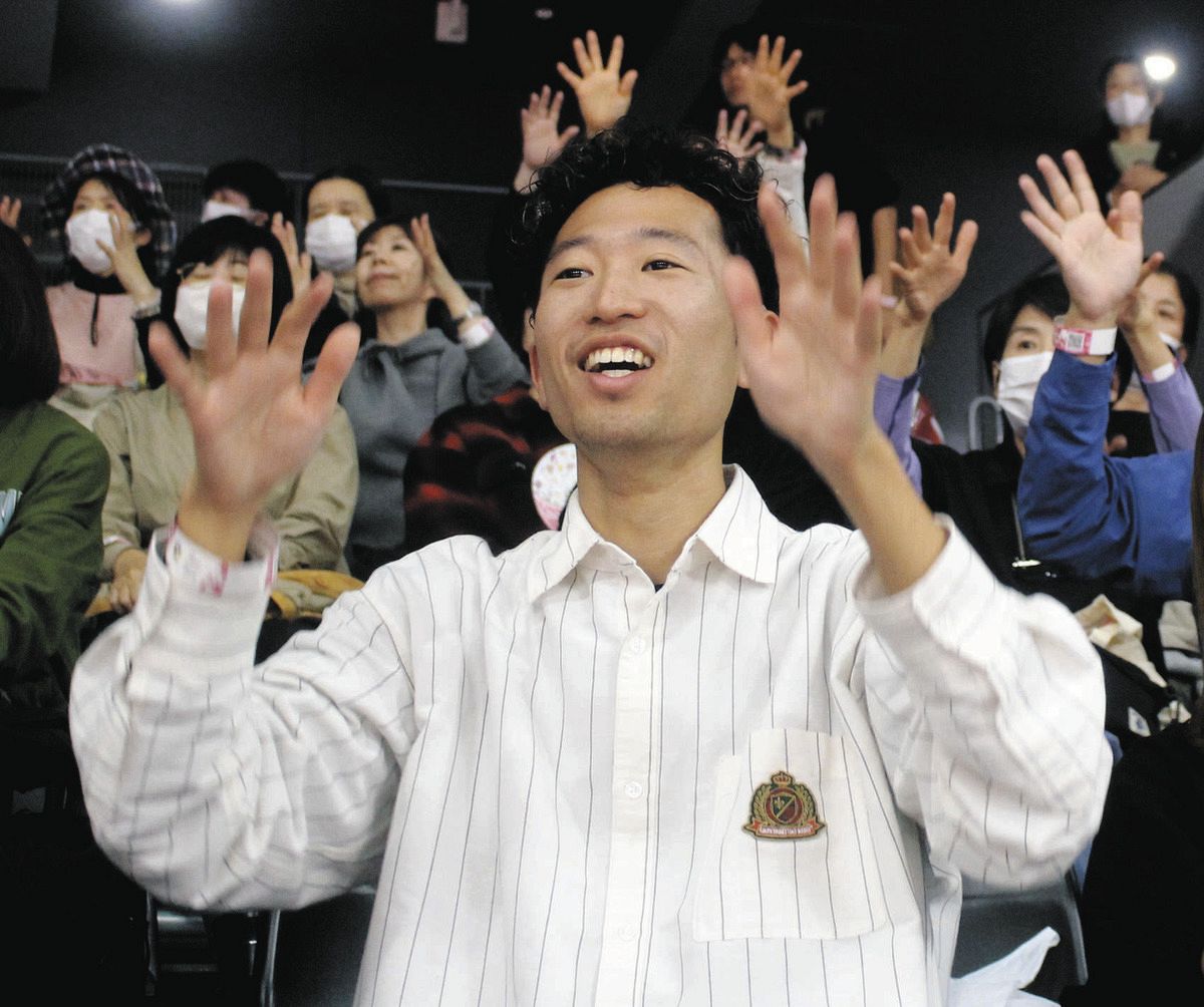 バドミントン会場で手話の拍手を送る川上天馬さん=11月16日、東京都調布市の京王アリーナTOKYOで