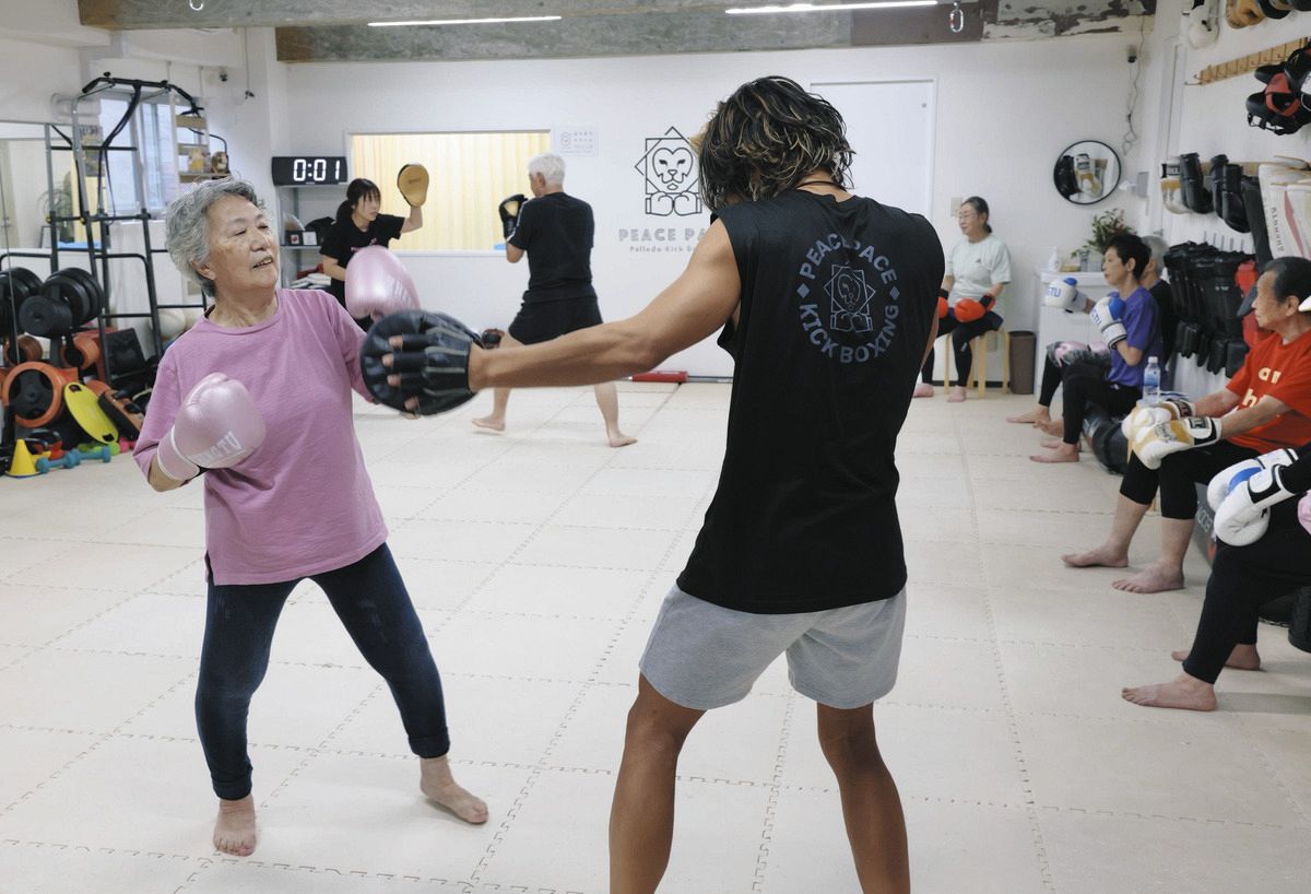 小田急線豪徳寺駅から徒歩5分のビル3階にキックボクシングジム「PEACE PACE」(ピースペース)はある。平日午後1時からのクラスは70歳以上が対象で、相談に応じて60代の人も受け付ける。
