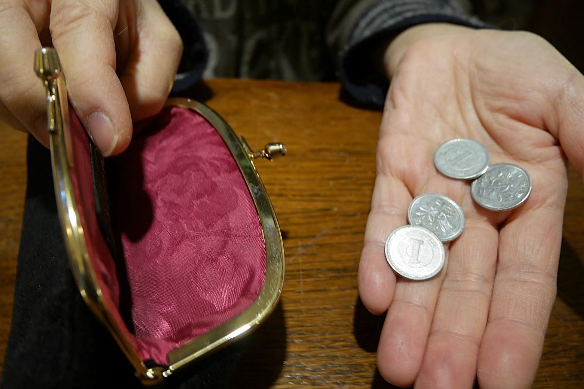 取材時、女性の財布には1円玉が4枚しか入っていなかった=東京都内で